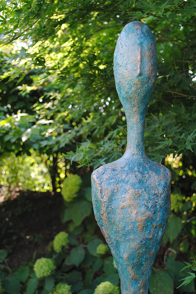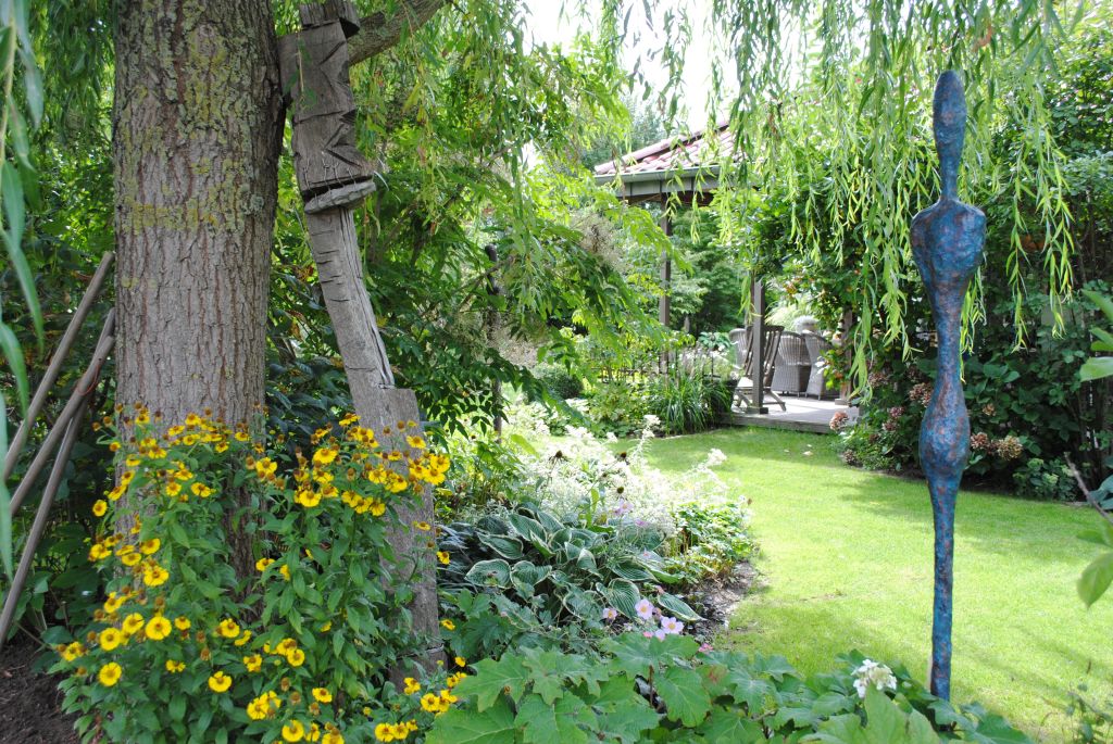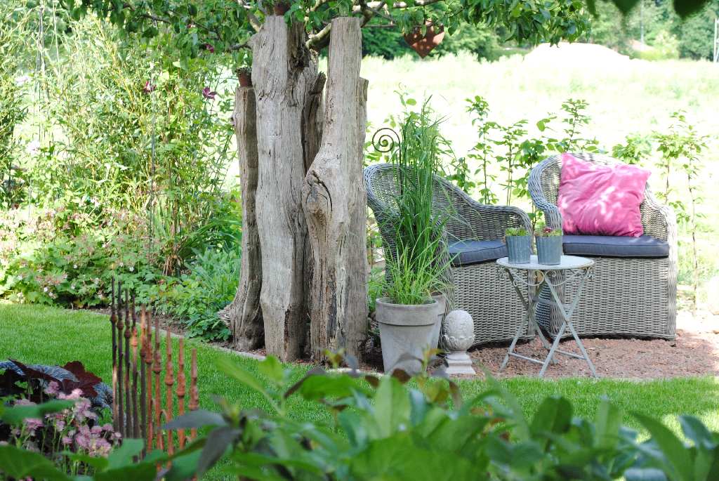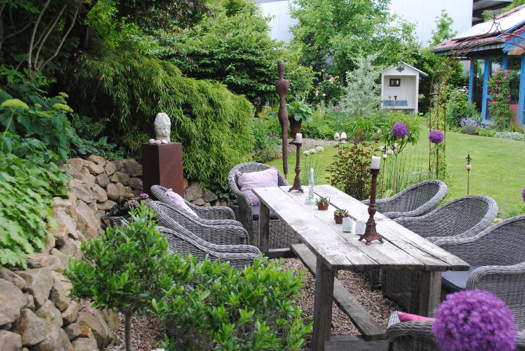 Schöne Gartendekorationen aus rostigem Eisen, Beton, Holz und Glas runden das Miteinander ab.