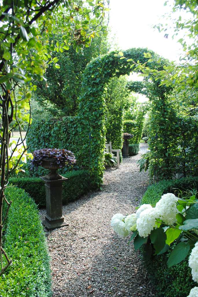 Der etwas andere Vorgarten mit Rundbögen aus Hainbuchen und Buchsbaum, führt in einen gemütlichen